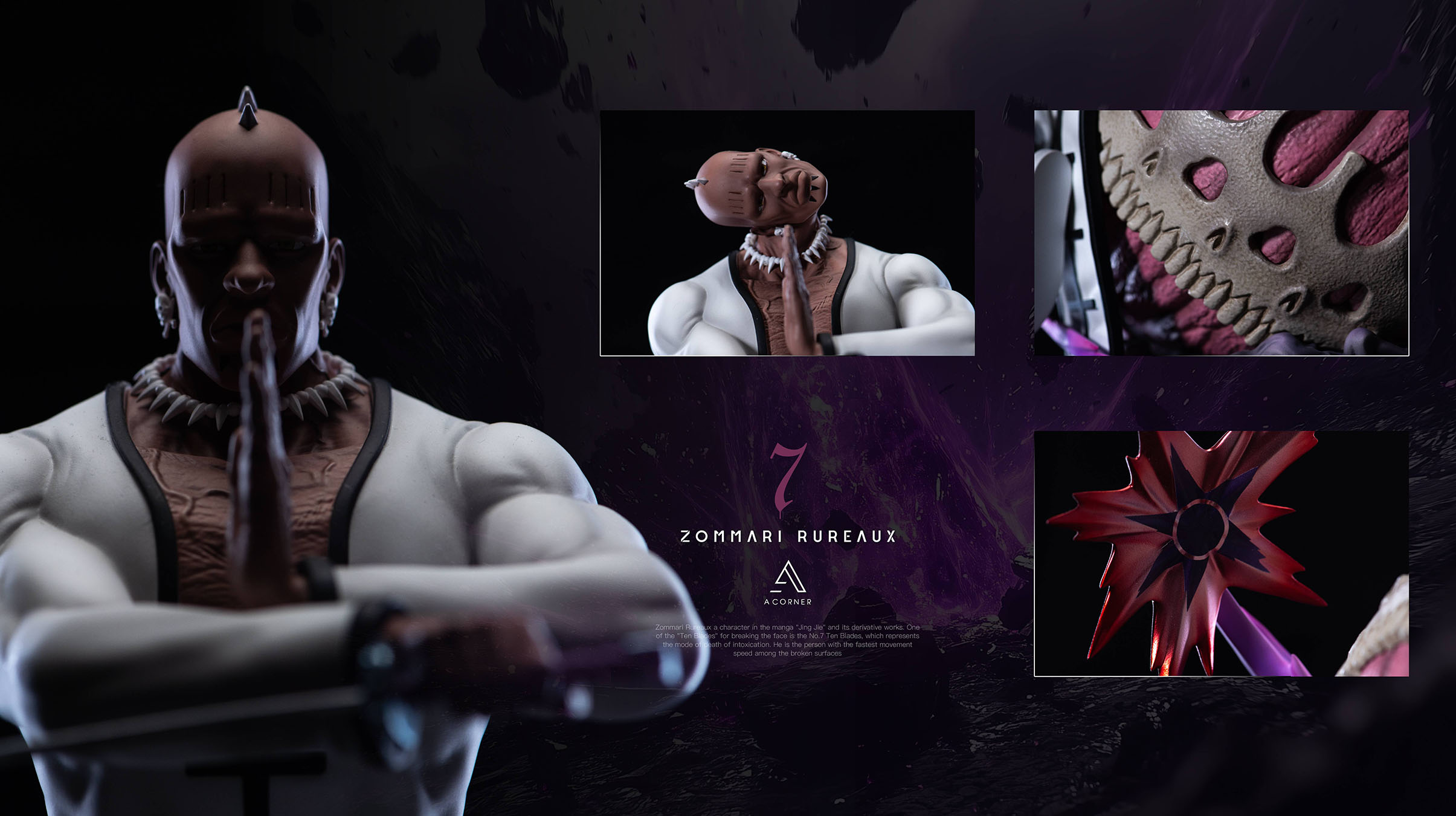 No.09: Character body + base + 4 head sculptures + two head sculpture bases + metal weapon + metal nameplate